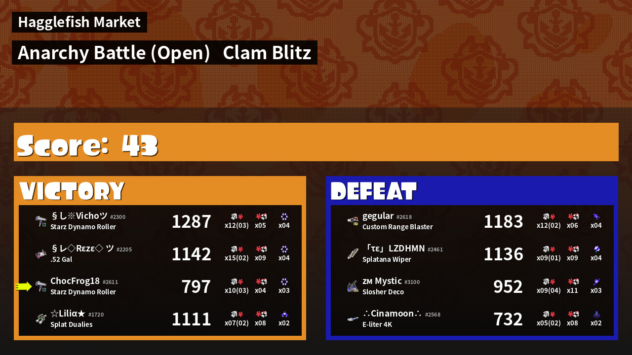 | Medals | #1 Popular Target #1 Splat Assister #1 Clam Stopper | ||