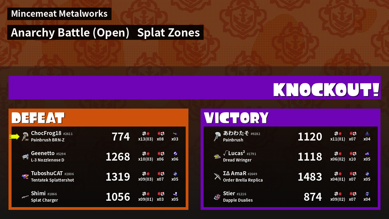 | Mode | Splat Zones - Anarchy Battle (Open) | ||