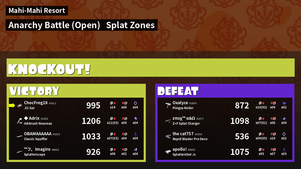 | Mode | Splat Zones - Anarchy Battle (Open) | ||