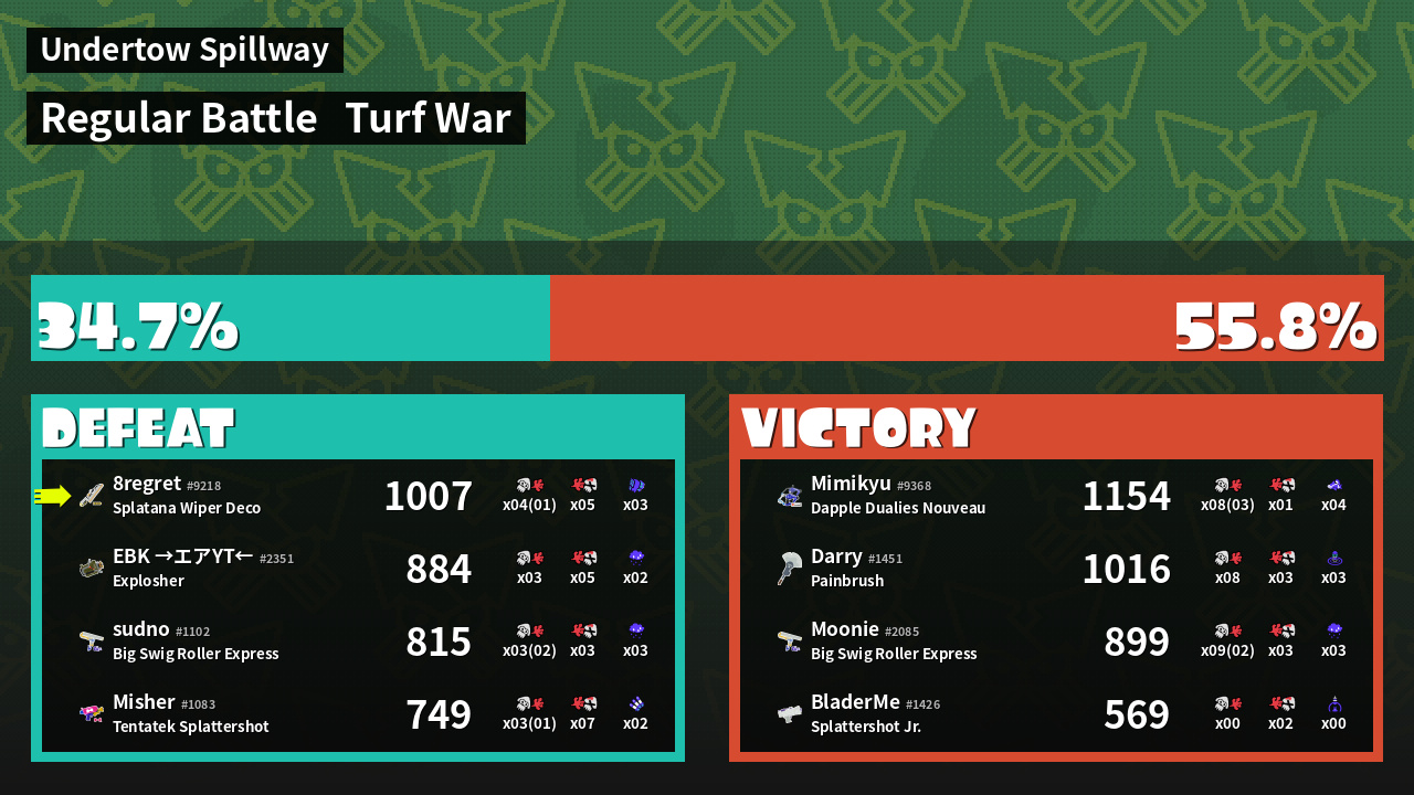 | Medals | #1 Overall Splatter #1 Turf Inker #1 Enemy Splatter | ||