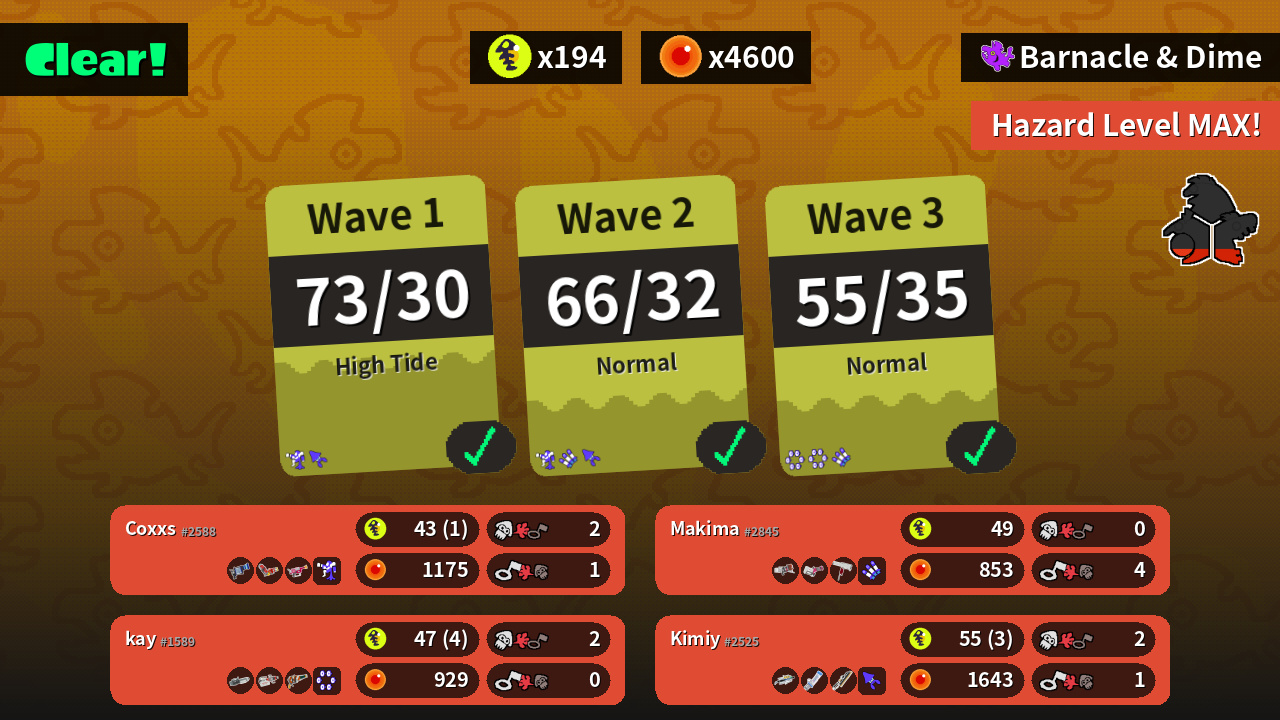 | Weapons | L-3 Nozzlenose Hydra Splatling Rapid Blaster Pro | Grizzco Brella Mint Decavitator Splatana Wiper | Blaster Heavy Splatling Flingza Roller | Ballpoint Splatling Heavy Edit Splatling Squeezer |