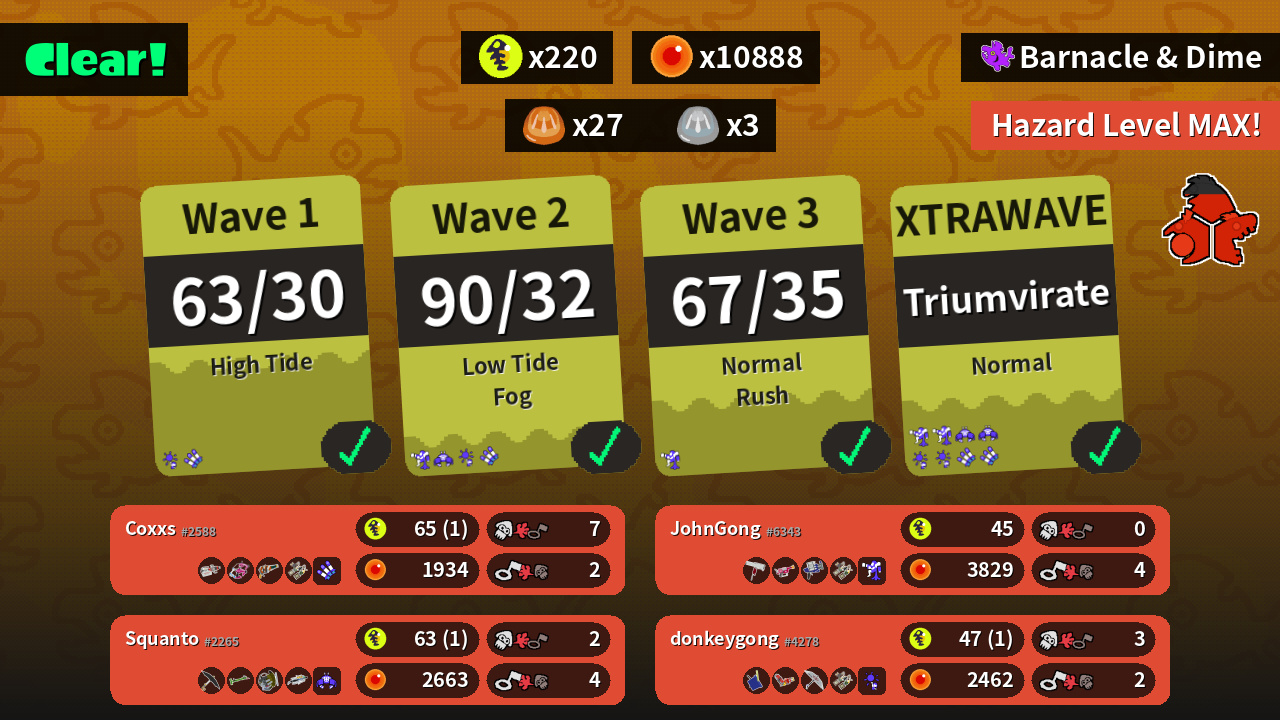 | Weapons | Heavy Edit Splatling Dapple Dualies Squeezer Grizzco Dualies | Undercover Brella Bamboozler 14 Mk I Grizzco Slosher Grizzco Brella | Tri-Slosher Hydra Splatling Splat Brella Grizzco Dualies | Flingza Roller Rapid Blaster Pro Clash Blaster Grizzco Dualies |