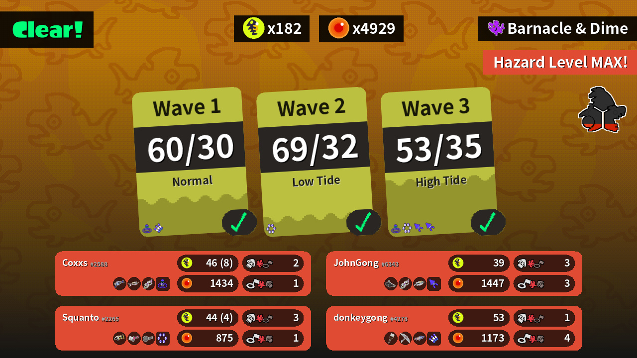 | Weapons | H-3 Nozzlenose Grizzco Charger Dark Tetra Dualies | Octobrush Splat Brella Splattershot Pro | Sploosh-o-matic Heavy Splatling Nautilus 47 | Bloblobber Dark Tetra Dualies Grizzco Brella |