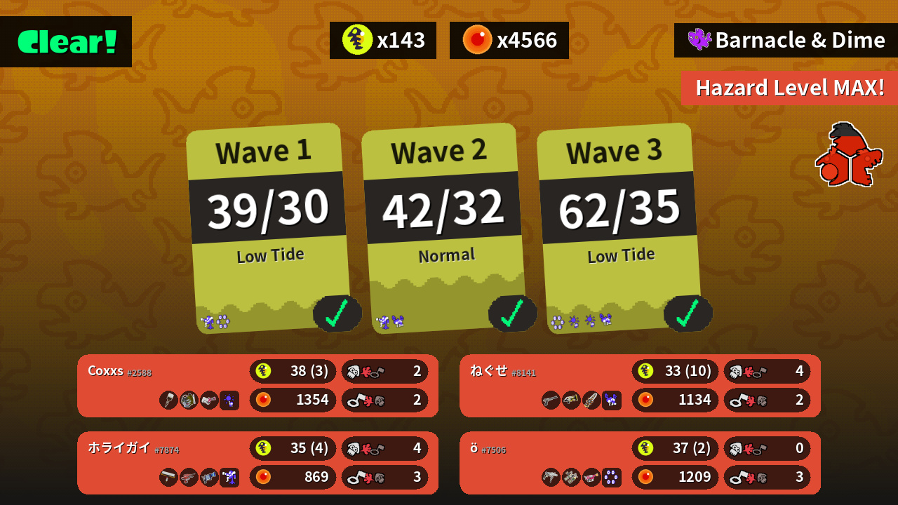 | Weapons | Octobrush Grizzco Slosher Heavy Splatling | Grizzco Roller Grizzco Dualies Rapid Blaster Pro | Carbon Roller Dualie Squelchers L-3 Nozzlenose | N-ZAP '85 Sploosh-o-matic Grizzco Splatana |
