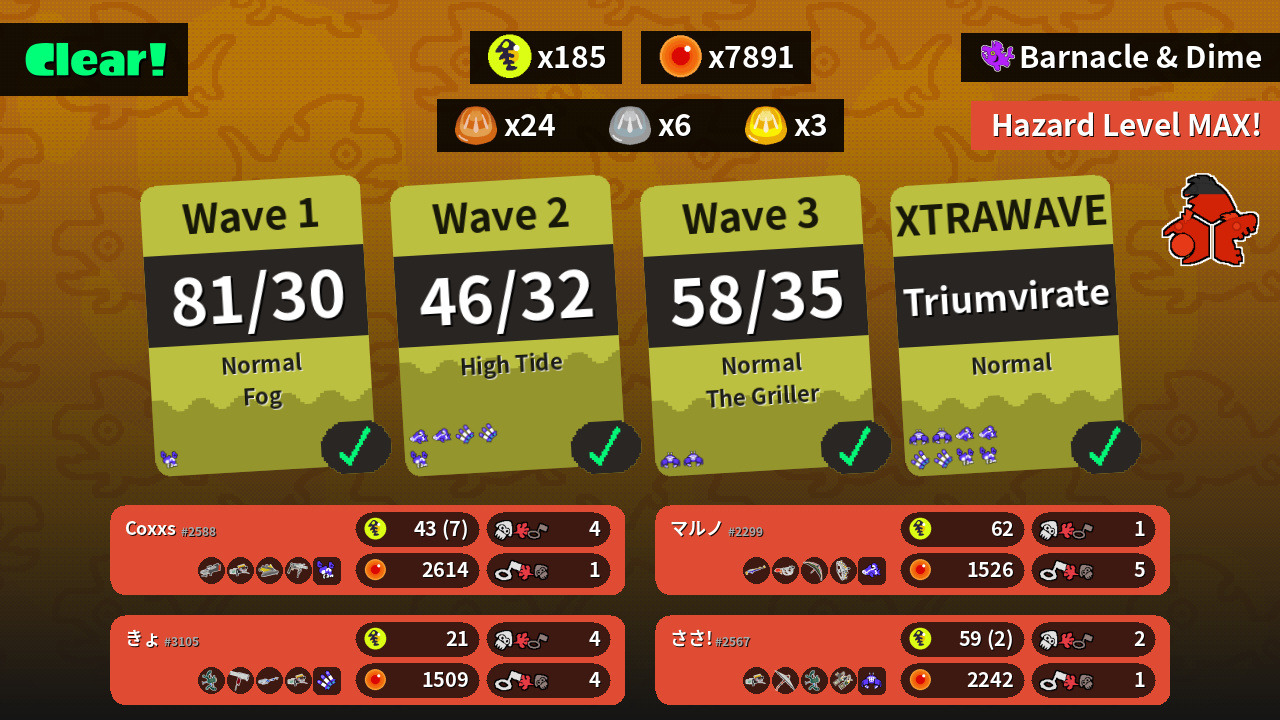 | Weapons | S-BLAST '92 Grizzco Blaster Dread Wringer Grizzco Roller | Splat Charger Goo Tuber Tenta Brella Grizzco Stringer | Grizzco Blaster Recycled Brella 24 Mk I Wellstring V Grizzco Dualies | Wellstring V Flingza Roller E-liter 4K Grizzco Blaster |
