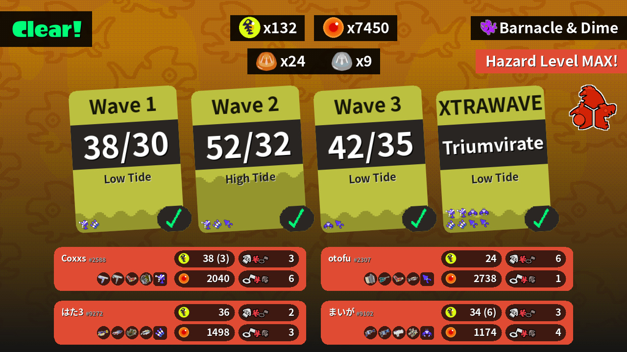 | Weapons | Big Swig Roller Dynamo Roller Hydra Splatling Grizzco Slosher | Mini Splatling Splattershot Pro Explosher Grizzco Brella | H-3 Nozzlenose L-3 Nozzlenose Splattershot Jr. Grizzco Dualies | Sloshing Machine Jet Squelcher Hydra Splatling Grizzco Charger |