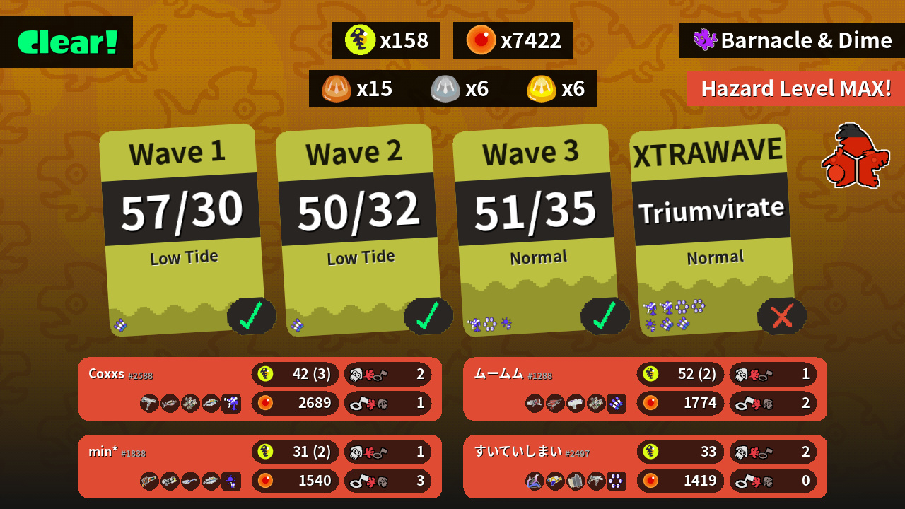 | Weapons | Dynamo Roller Grizzco Charger Grizzco Dualies Grizzco Brella | Blaster Dualie Squelchers Splattershot Jr. Grizzco Dualies | Slosher Splattershot Sloshing Machine Grizzco Roller | Squeezer Splattershot Nova E-liter 4K Grizzco Brella |
