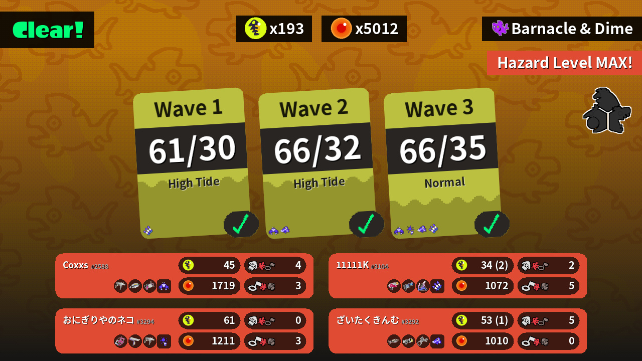| Weapons | Grizzco Roller Grizzco Brella .52 Gal | Dapple Dualies Splat Roller Grizzco Roller | Grizzco Charger Splattershot Nova Aerospray MG | Rapid Blaster L-3 Nozzlenose Slosher |
