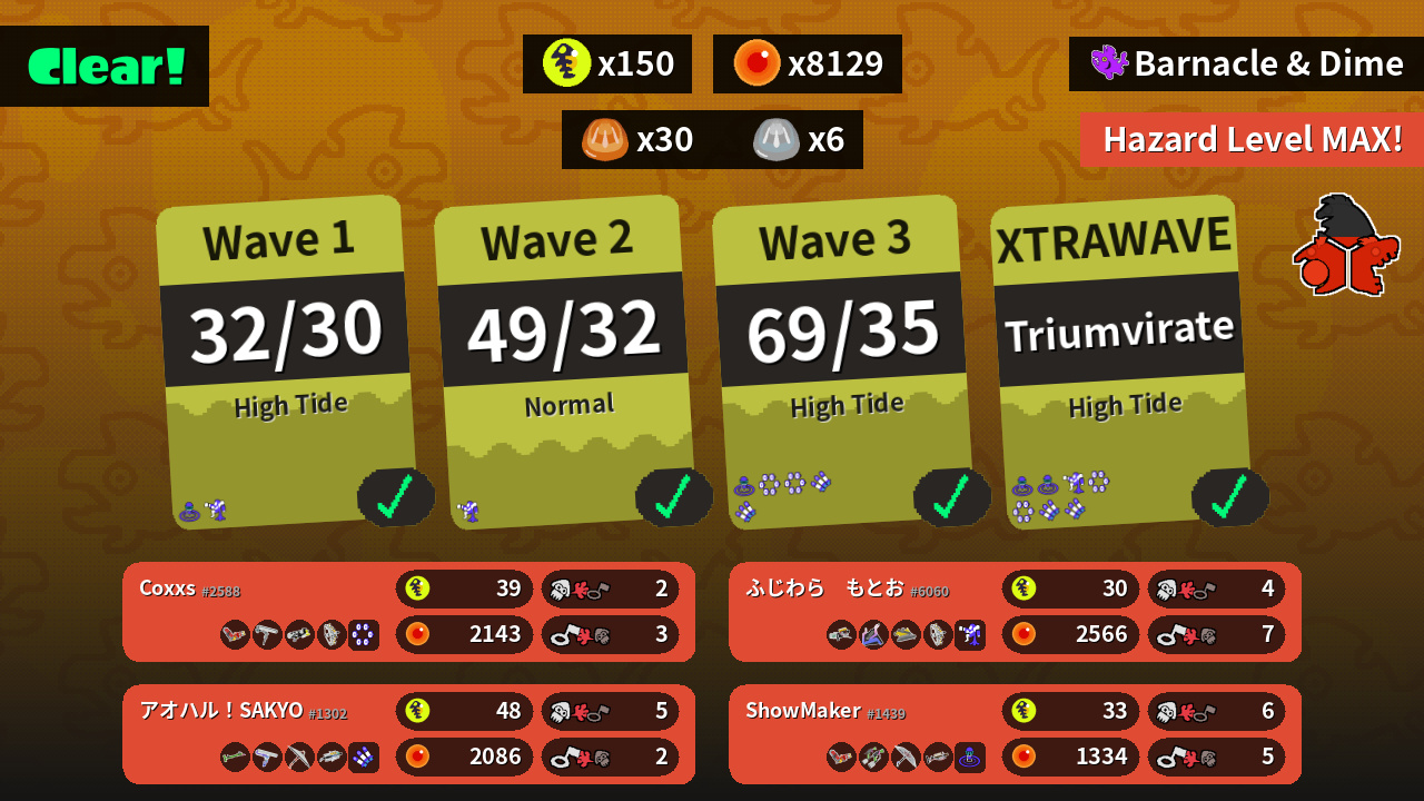 | Weapons | Hydra Splatling Dynamo Roller Splattershot Nova Grizzco Stringer | Bamboozler 14 Mk I Big Swig Roller Recycled Brella 24 Mk I Grizzco Brella | Hydra Splatling Splat Dualies Splat Brella Grizzco Charger | Grizzco Blaster Slosher Dread Wringer Grizzco Stringer |