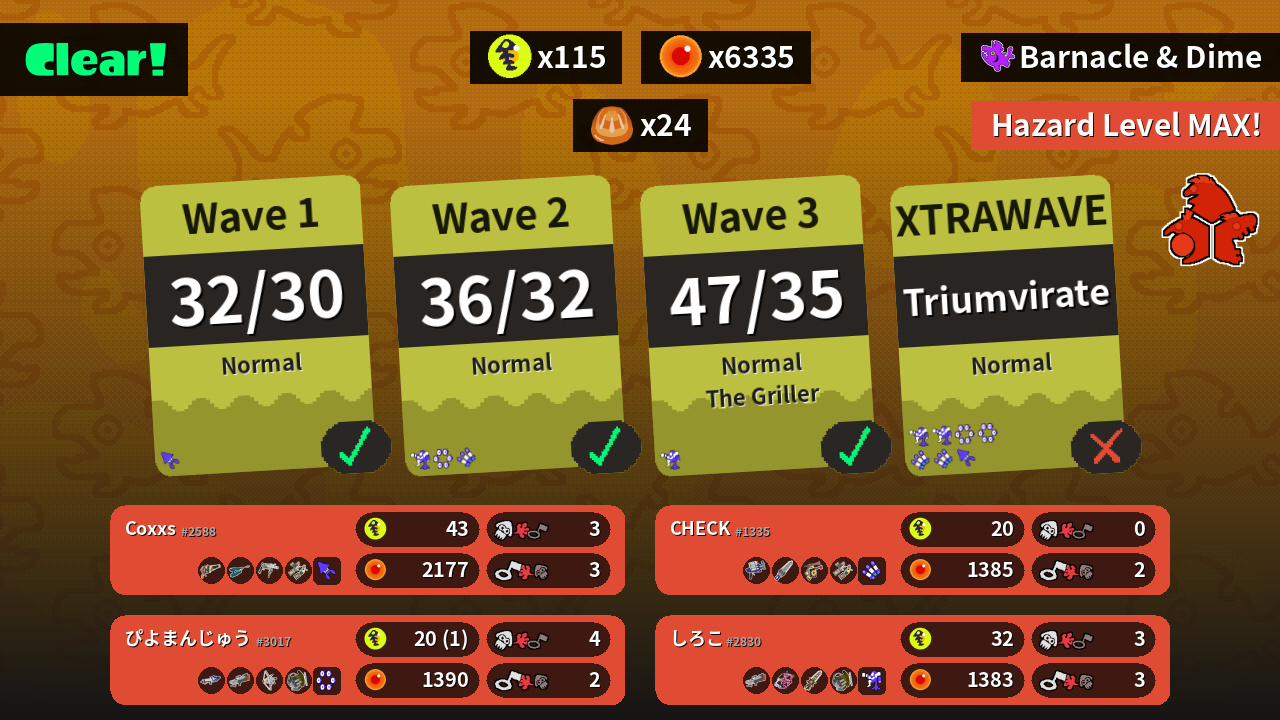 | Weapons | Squeezer Jet Squelcher Grizzco Roller Grizzco Dualies | S-BLAST '92 Dapple Dualies Grizzco Splatana Grizzco Slosher | Splattershot Pro S-BLAST '92 Tri-Stringer Grizzco Slosher | Clash Blaster Splatana Stamper Douser Dualies FF Grizzco Dualies |