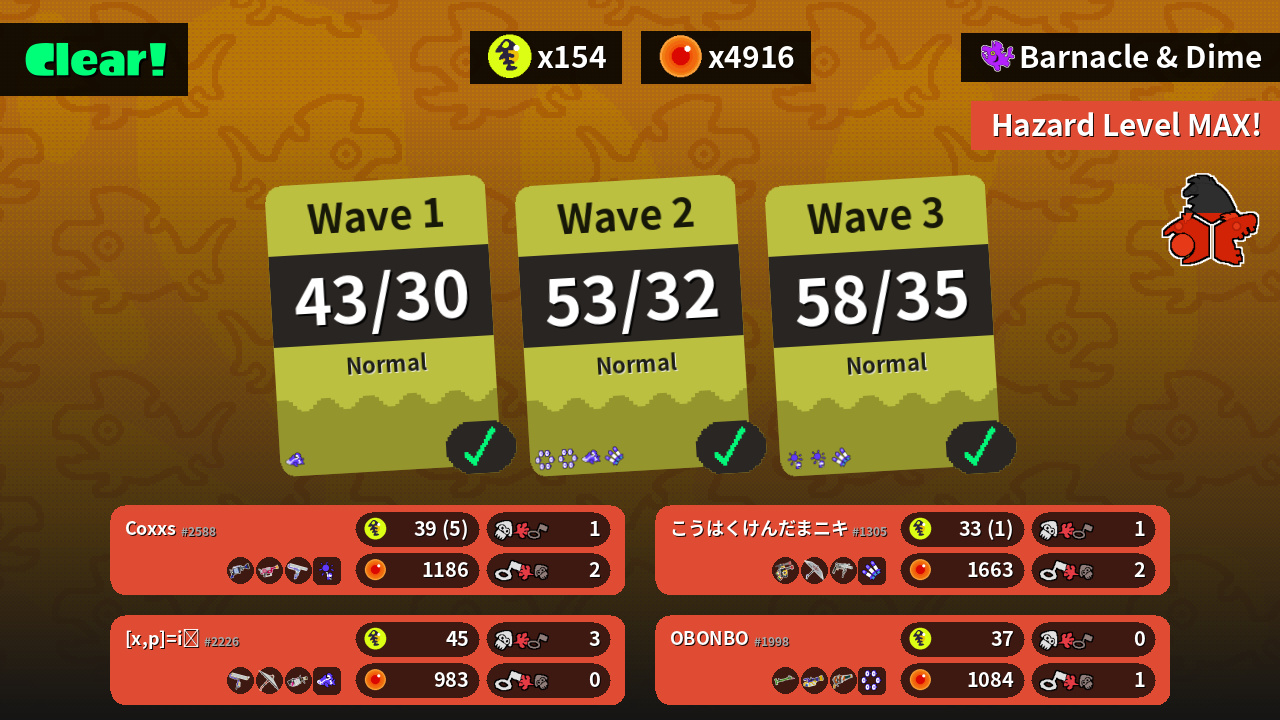 | Weapons | H-3 Nozzlenose Rapid Blaster Pro Big Swig Roller | Splat Roller Recycled Brella 24 Mk I .96 Gal | Bamboozler 14 Mk I Mini Splatling Squeezer | Douser Dualies FF Splat Brella Grizzco Roller |