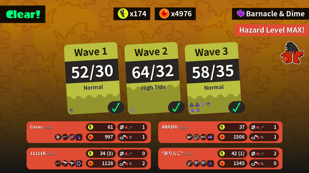 | Weapons | Tri-Stringer N-ZAP '85 Dapple Dualies | Douser Dualies FF Clash Blaster Clash Blaster | Heavy Edit Splatling Grizzco Slosher Blaster | Bamboozler 14 Mk I Flingza Roller Big Swig Roller |
