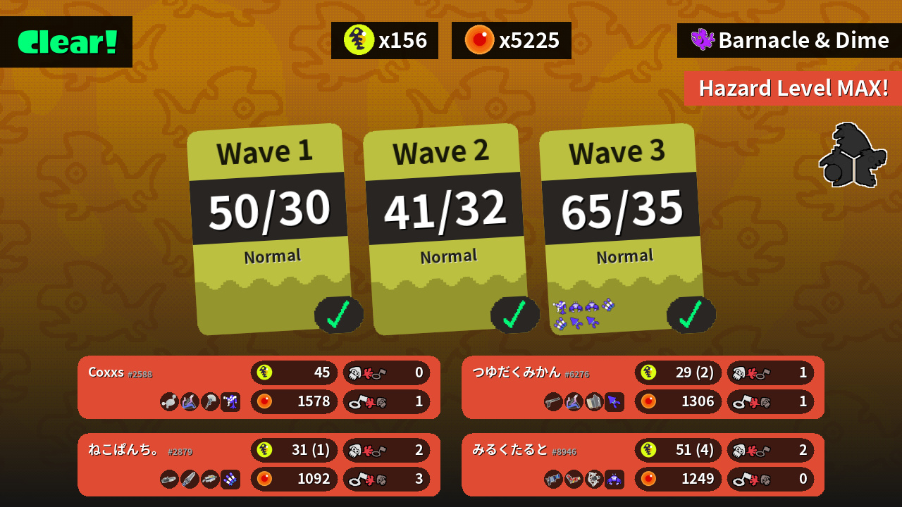 | Weapons | Luna Blaster Slosher Painbrush | L-3 Nozzlenose Hydra Splatling REEF-LUX 450 | Ballpoint Splatling Splatana Stamper Grizzco Brella | N-ZAP '85 Slosher Sloshing Machine |