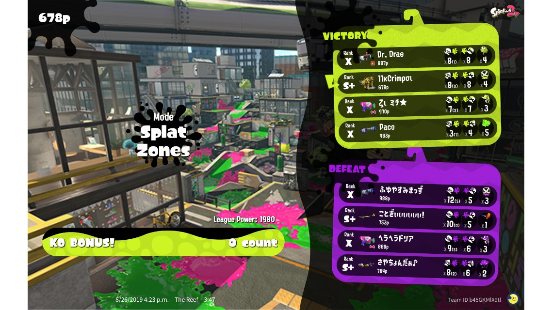 | Mode | Splat Zones - League Battle (Quad) | ||||||||||||||||||||||||||||
