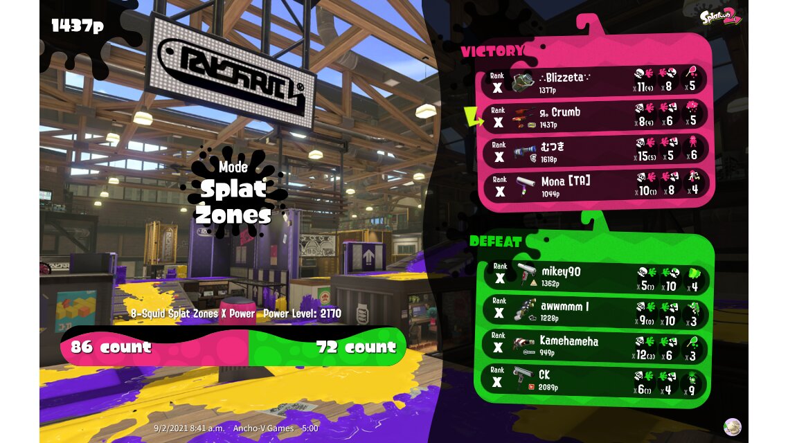 | Mode | Splat Zones - Ranked Battle | |||||||||||||||||||||||||||||||