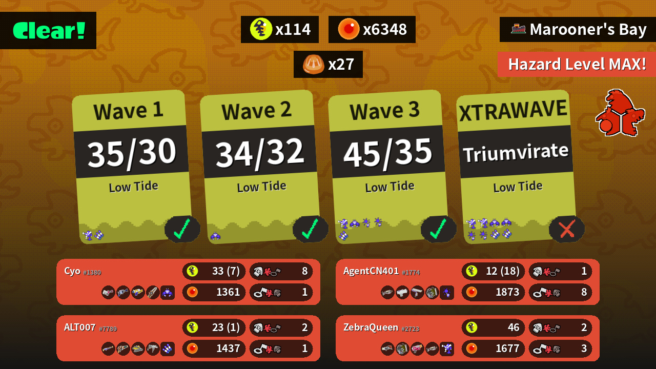 | Weapons | Heavy Splatling H-3 Nozzlenose Splattershot Grizzco Splatana | Range Blaster Grizzco Slosher Rapid Blaster Grizzco Charger | Splat Charger Squeezer Dread Wringer Grizzco Roller | Grizzco Charger Splattershot Jr. Splat Roller Grizzco Slosher |