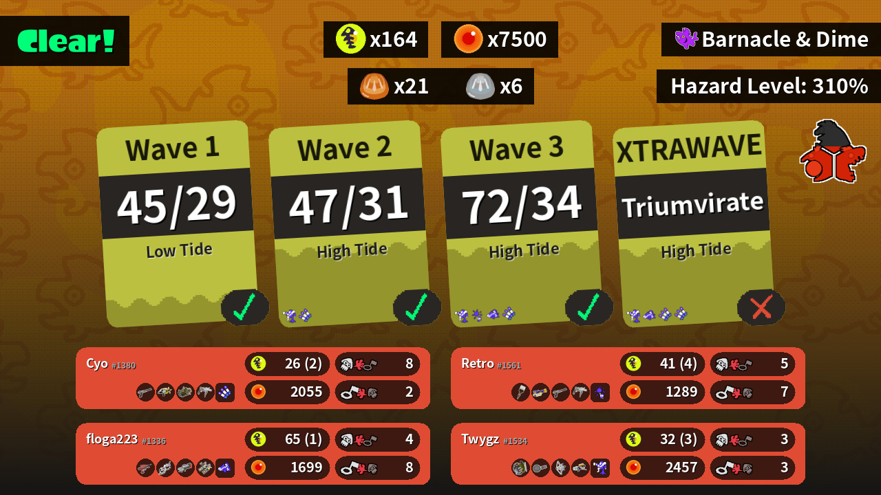 | Weapons | N-ZAP '85 Splash-o-matic Explosher Grizzco Roller | Dualie Squelchers Dark Tetra Dualies S-BLAST '92 Grizzco Dualies | Octobrush Mini Splatling N-ZAP '85 Grizzco Roller | Grizzco Slosher Nautilus 47 Tri-Stringer Grizzco Blaster |