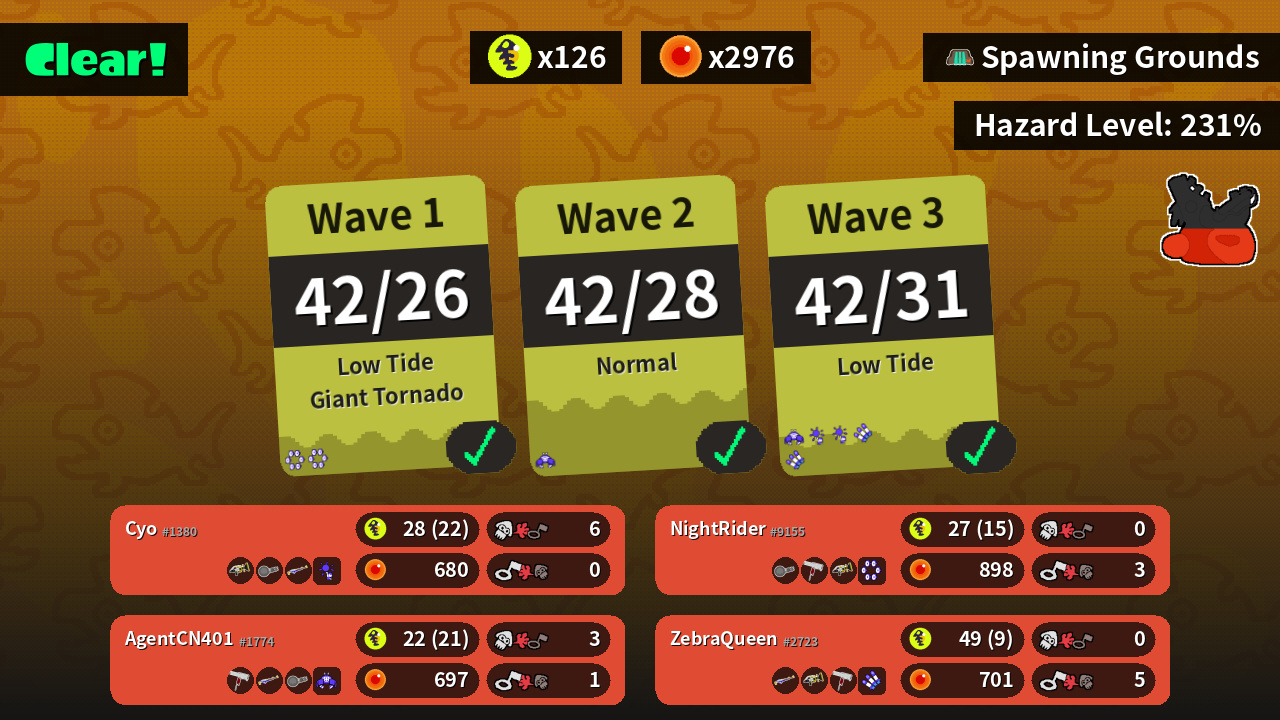 | Weapons | Sploosh-o-matic Nautilus 47 Splat Charger | Splat Charger Sploosh-o-matic Flingza Roller | Nautilus 47 Flingza Roller Sploosh-o-matic | Flingza Roller Splat Charger Nautilus 47 |