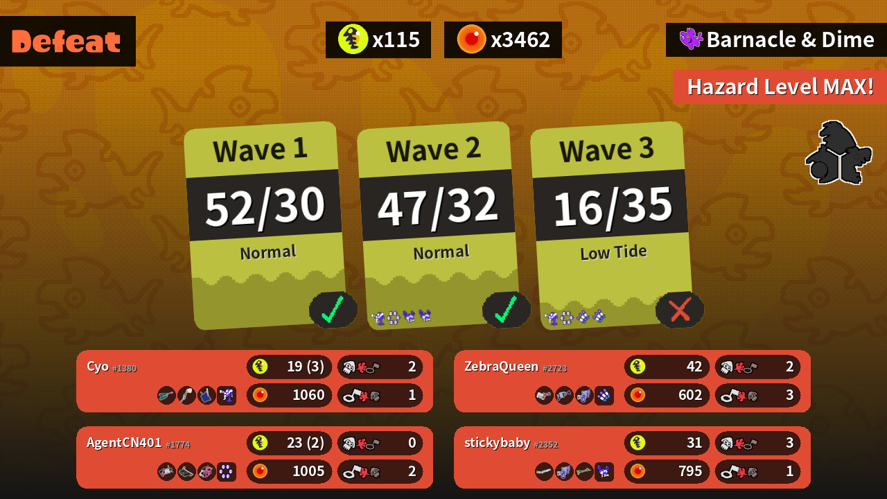 | Weapons | Jet Squelcher Inkbrush Tri-Slosher | Heavy Splatling H-3 Nozzlenose Glooga Dualies | Classic Squiffer Glooga Dualies Bamboozler 14 Mk I | .52 Gal Bloblobber Dapple Dualies |