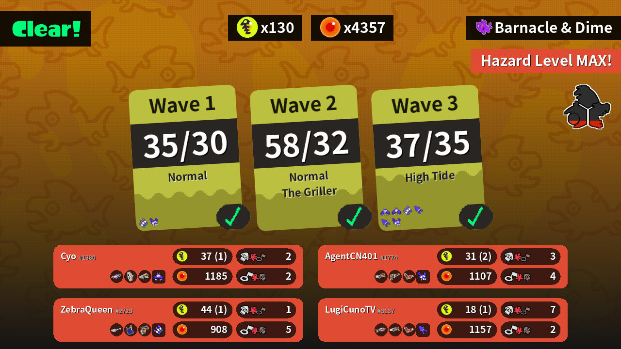 | Weapons | Splattershot Pro Grizzco Stringer Grizzco Blaster | E-liter 4K Tri-Slosher Douser Dualies FF | Range Blaster Squeezer Hydra Splatling | Grizzco Charger Range Blaster Hydra Splatling |