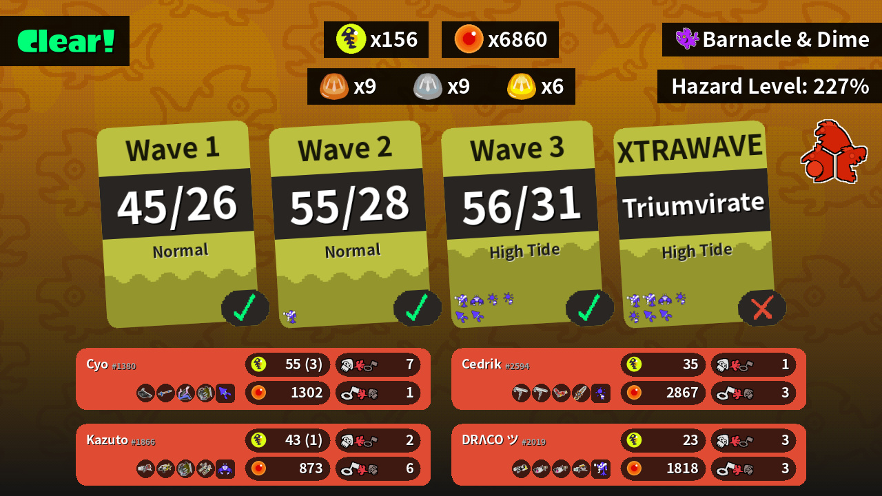 | Weapons | Bloblobber Snipewriter 5H Slosher Grizzco Slosher | Blaster Splash-o-matic Grizzco Slosher Grizzco Dualies | Dynamo Roller Dynamo Roller Hydra Splatling Grizzco Splatana | Splattershot Nova .96 Gal .96 Gal Grizzco Blaster |