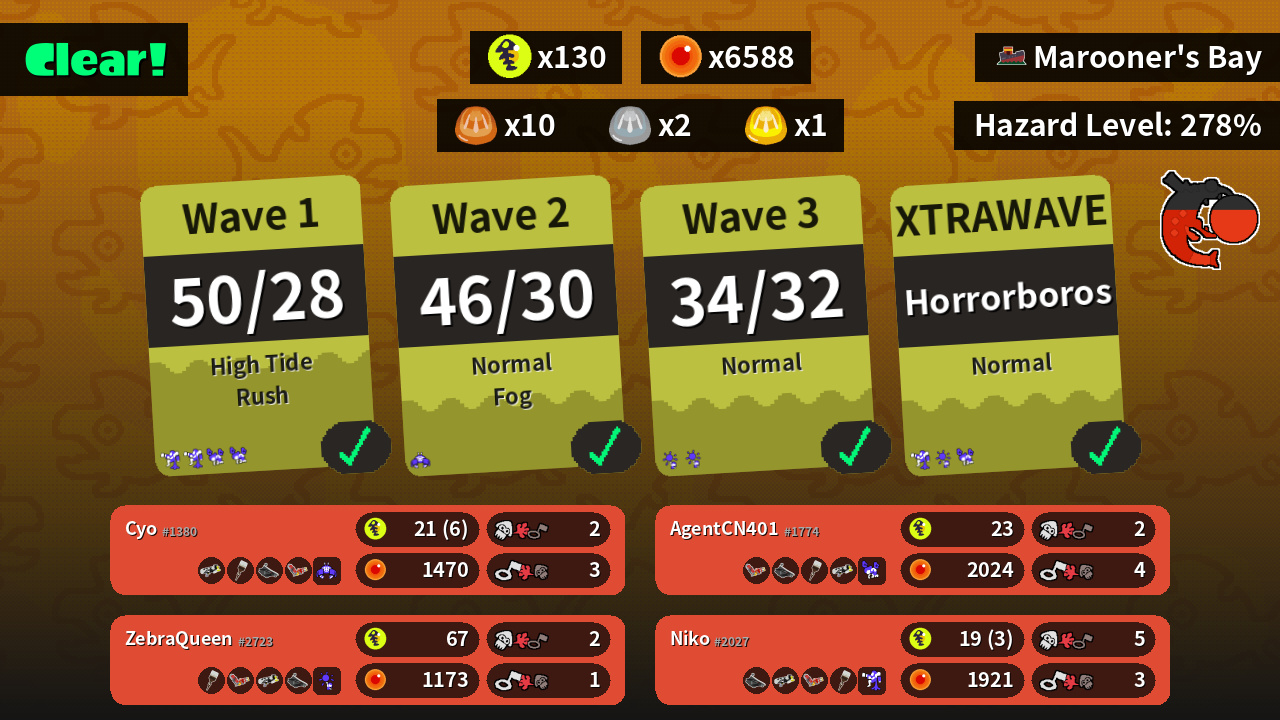 | Weapons | Splattershot Nova Octobrush Bloblobber Hydra Splatling | Octobrush Hydra Splatling Splattershot Nova Bloblobber | Hydra Splatling Bloblobber Octobrush Splattershot Nova | Bloblobber Splattershot Nova Hydra Splatling Octobrush |
