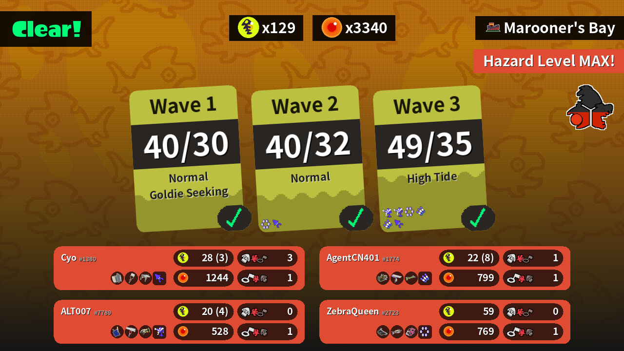 | Weapons | Sloshing Machine Octobrush Grizzco Roller | Bloblobber Grizzco Charger Dapple Dualies | Explosher Splat Roller Bamboozler 14 Mk I | Tri-Slosher Flingza Roller Sploosh-o-matic |