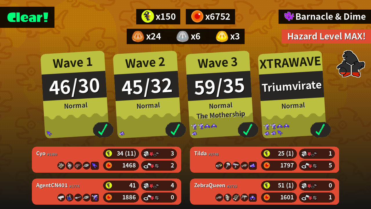 | Weapons | Grizzco Dualies Tri-Stringer Dualie Squelchers Grizzco Brella | Grizzco Charger Grizzco Stringer Splat Dualies Grizzco Roller | Splattershot Jr. Tri-Slosher E-liter 4K Grizzco Brella | Splattershot Nova Painbrush Splat Roller Grizzco Charger |