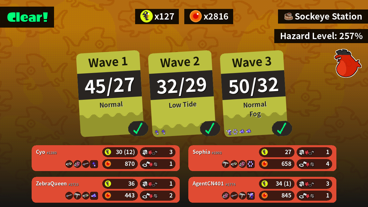 | Weapons | Splattershot Nova Dapple Dualies Snipewriter 5H | Snipewriter 5H Dynamo Roller Splattershot Nova | Dapple Dualies Snipewriter 5H Dynamo Roller | Dynamo Roller Splattershot Nova Dapple Dualies |