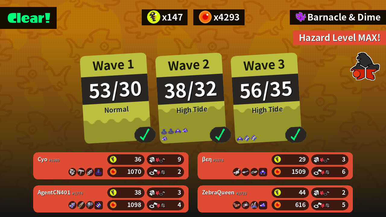 | Weapons | REEF-LUX 450 Dynamo Roller Dark Tetra Dualies | Hydra Splatling .52 Gal Slosher | Glooga Dualies Grizzco Splatana Clash Blaster | Luna Blaster E-liter 4K Ballpoint Splatling |