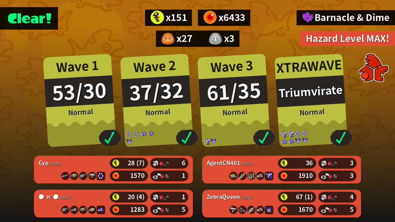 | Weapons | Splat Charger Splash-o-matic H-3 Nozzlenose Grizzco Roller | Splat Roller Bloblobber Dark Tetra Dualies Grizzco Blaster | Dread Wringer Splatana Wiper Grizzco Slosher Grizzco Blaster | H-3 Nozzlenose Grizzco Charger Sploosh-o-matic Grizzco Brella |
