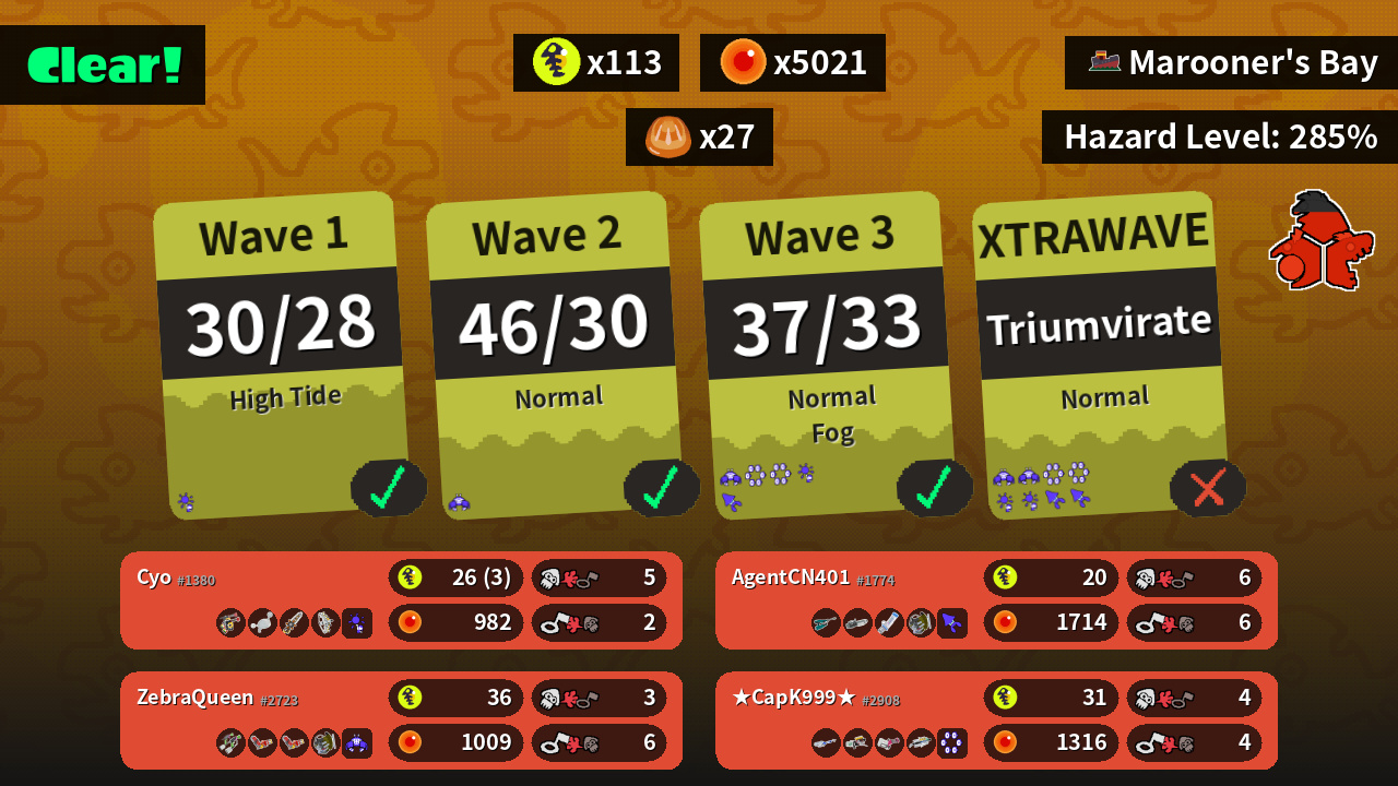 | Weapons | Douser Dualies FF Luna Blaster Grizzco Splatana Grizzco Stringer | Splat Dualies Hydra Splatling Hydra Splatling Grizzco Slosher | E-liter 4K Grizzco Blaster Heavy Splatling Grizzco Brella | Jet Squelcher Ballpoint Splatling Mint Decavitator Grizzco Slosher |