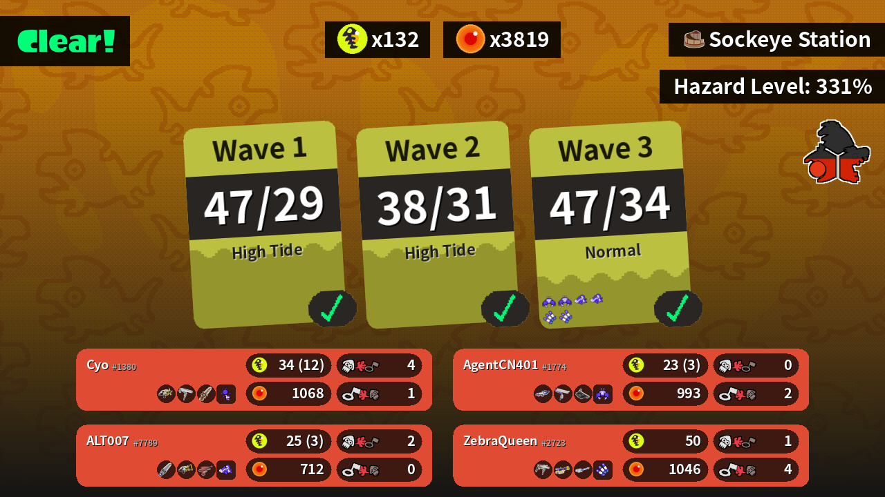 | Weapons | Splash-o-matic Dynamo Roller Grizzco Splatana | Grizzco Roller Mini Splatling E-liter 4K | Splatana Stamper Sploosh-o-matic Dualie Squelchers | Splattershot Pro Splat Roller Bloblobber |