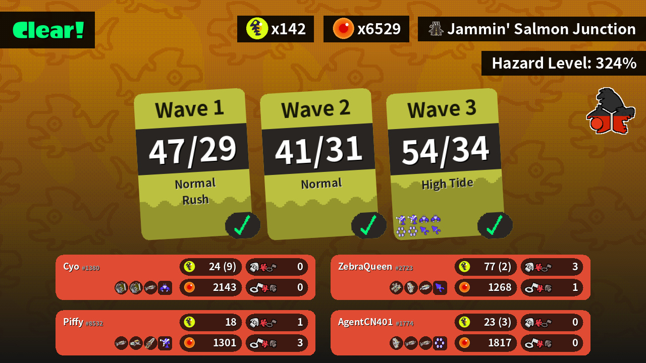 | Weapons | Grizzco Slosher Grizzco Slosher Grizzco Charger | Grizzco Dualies Grizzco Stringer Grizzco Brella | Grizzco Stringer Grizzco Charger Grizzco Charger | Grizzco Charger Grizzco Blaster Grizzco Splatana |