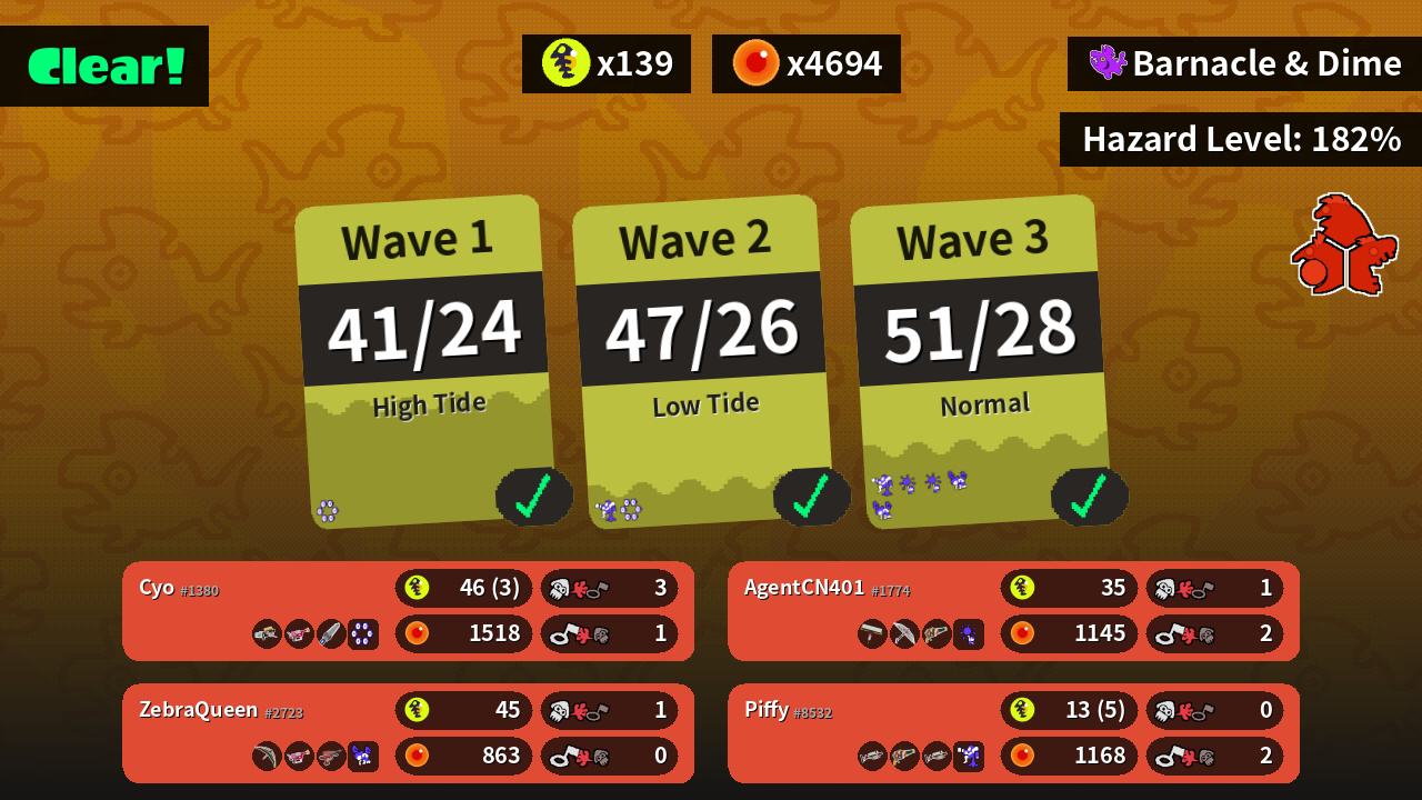 | Weapons | Grizzco Blaster Rapid Blaster Pro Splatana Stamper | Tenta Brella Rapid Blaster Pro Dualie Squelchers | Carbon Roller Splat Brella Squeezer | Grizzco Charger Squeezer Grizzco Charger |