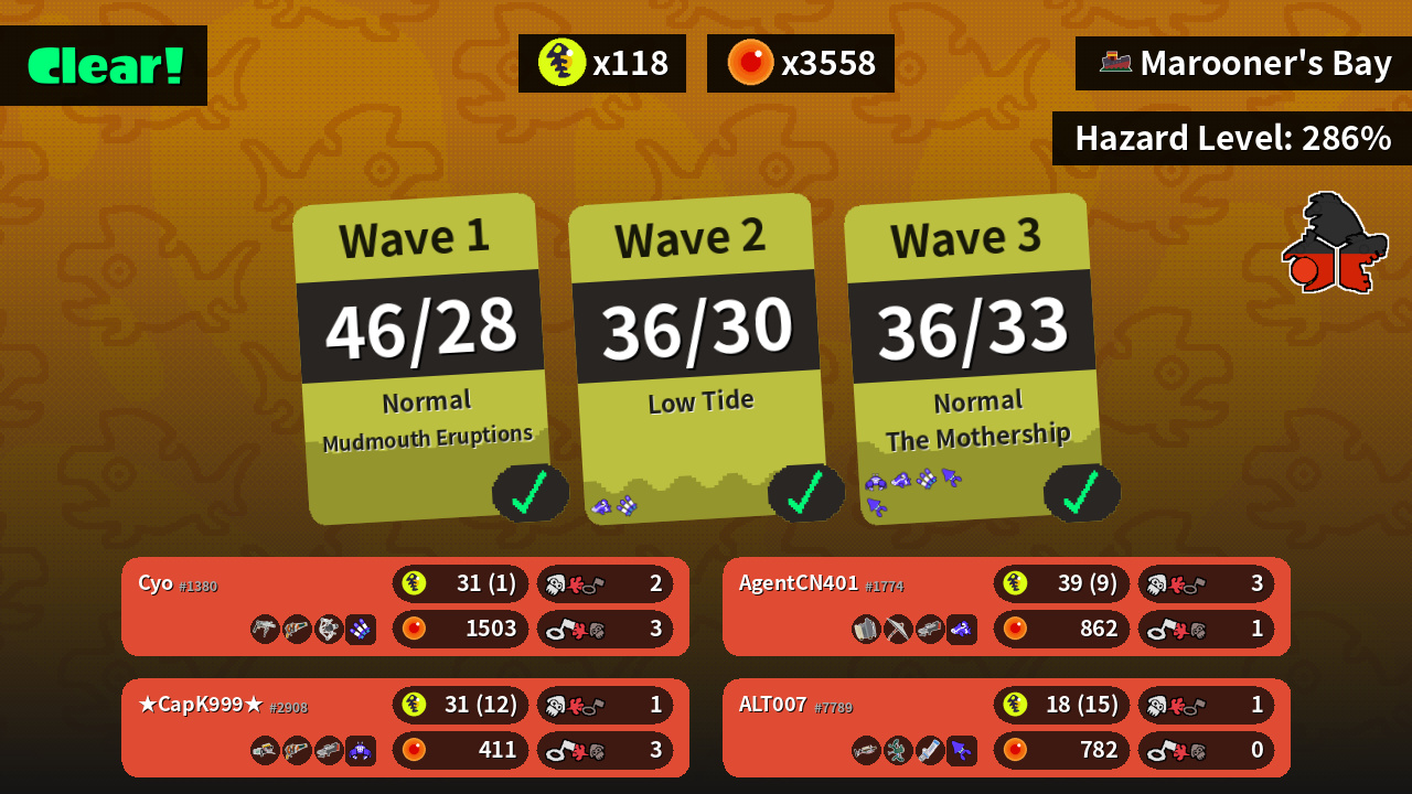 | Weapons | Grizzco Roller Squeezer REEF-LUX 450 | Sloshing Machine Recycled Brella 24 Mk I S-BLAST '92 | Grizzco Blaster Squeezer S-BLAST '92 | Grizzco Charger Wellstring V Mint Decavitator |