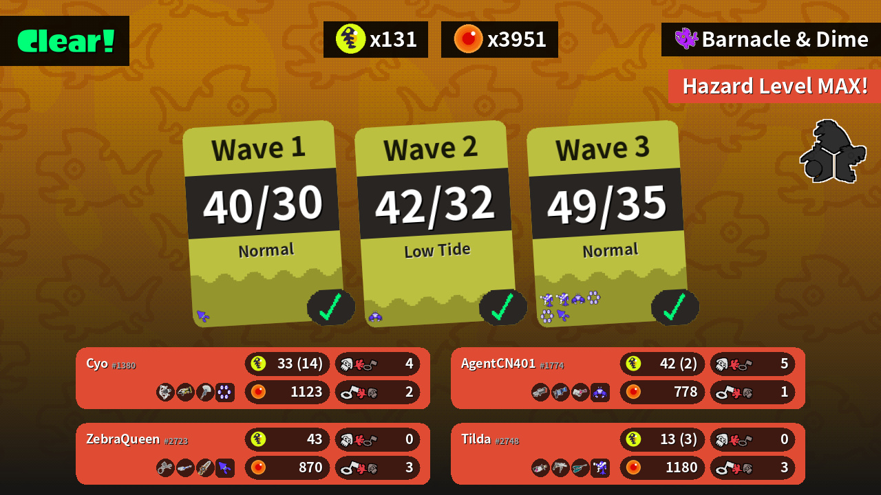 | Weapons | REEF-LUX 450 Sploosh-o-matic Painbrush | Aerospray MG E-liter 4K Grizzco Splatana | S-BLAST '92 L-3 Nozzlenose Heavy Splatling | .96 Gal Grizzco Roller Jet Squelcher |