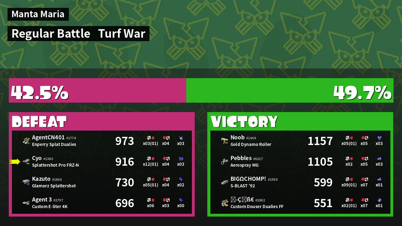| Medals | #1 Overall Splatter #1 Popular Target #1 Enemy-Base Inker | ||