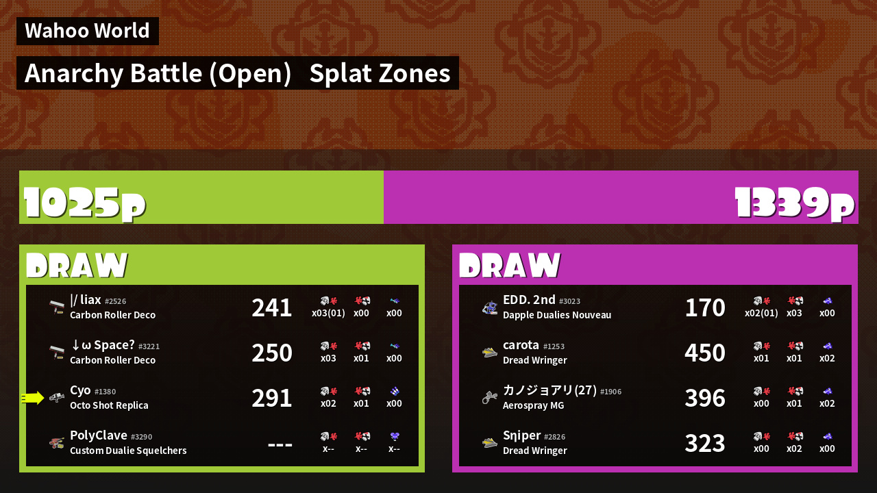 | Mode | Splat Zones - Anarchy Battle (Open) | ||