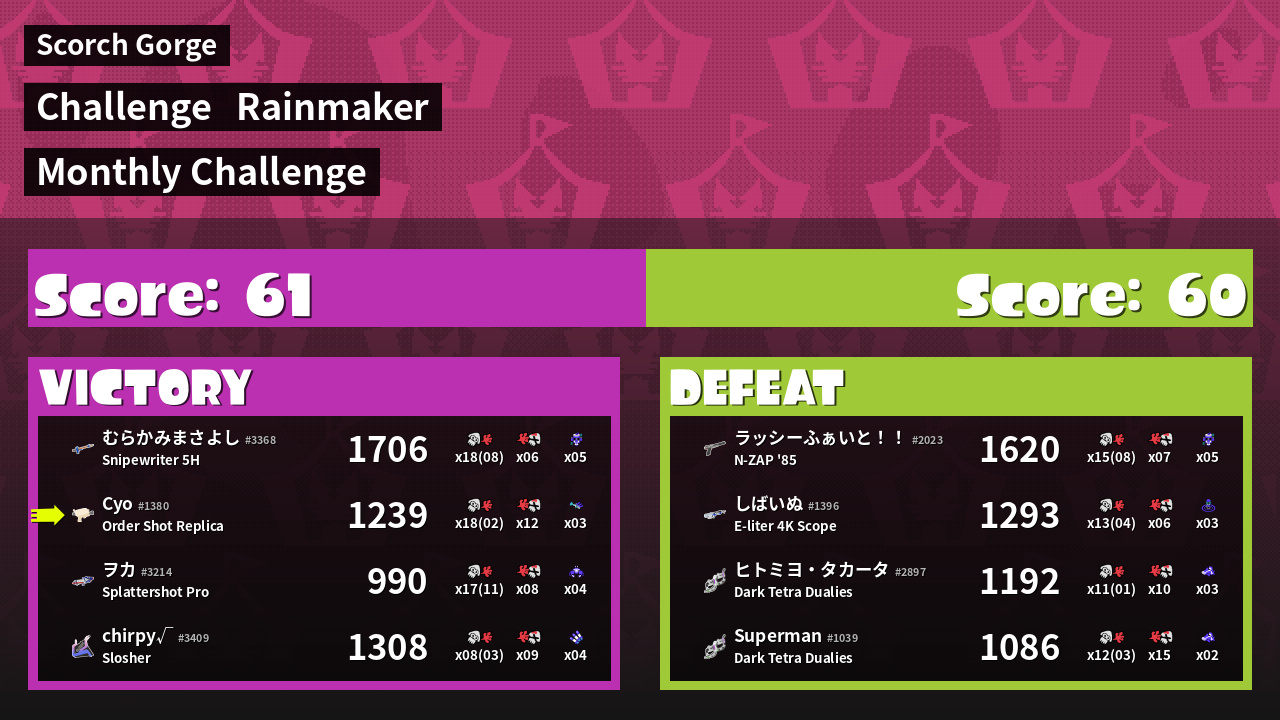 | Medals | #1 Overall Splatter #1 Enemy Splatter #1 Rainmaker Stopper | ||