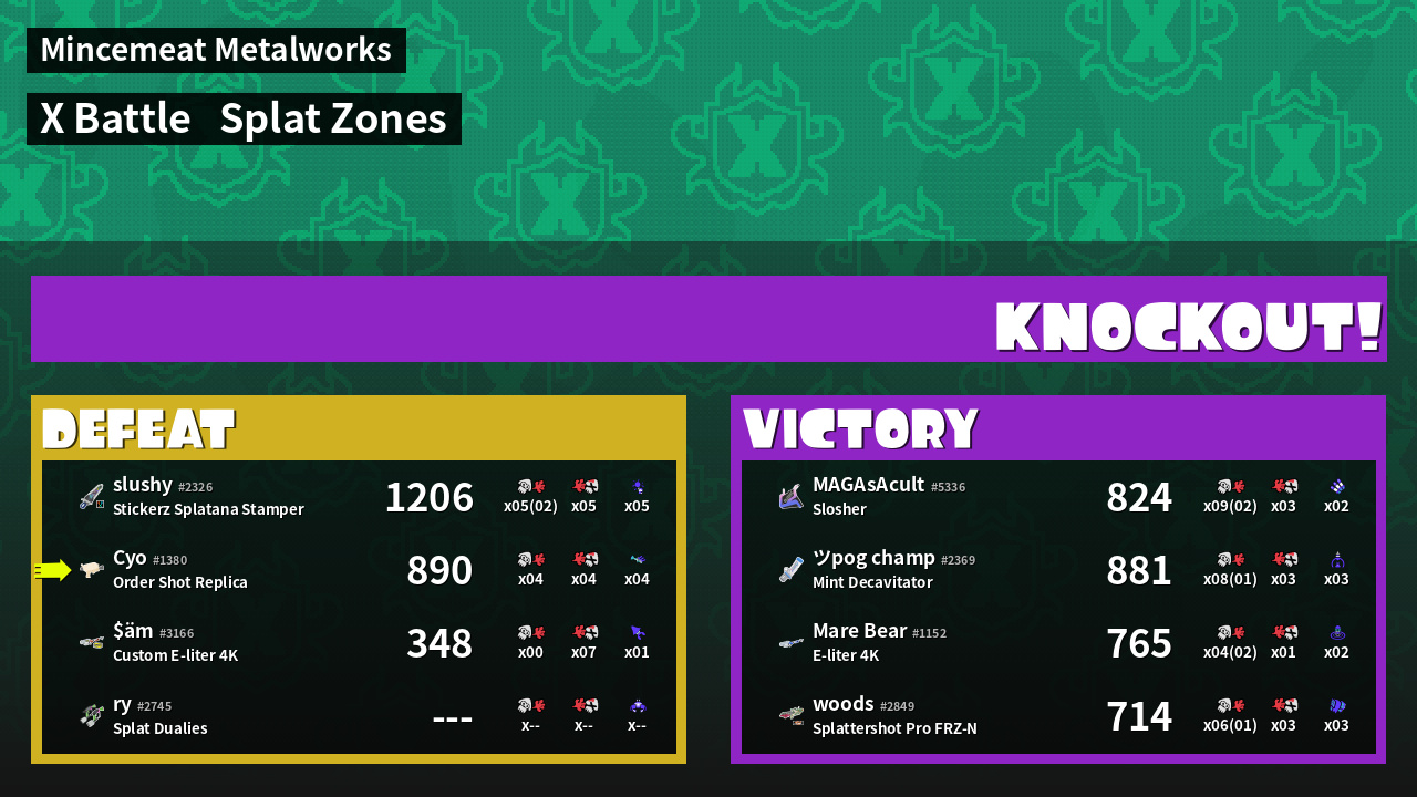 | Medals | #1 Splat Zone Guard #1 Enemy Splatter #1 Splat Zone Hero | ||