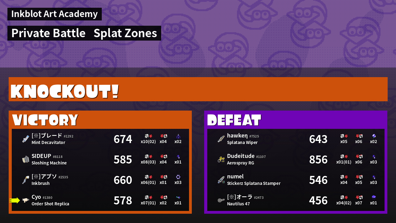 | Mode | Splat Zones - Private Battle | ||