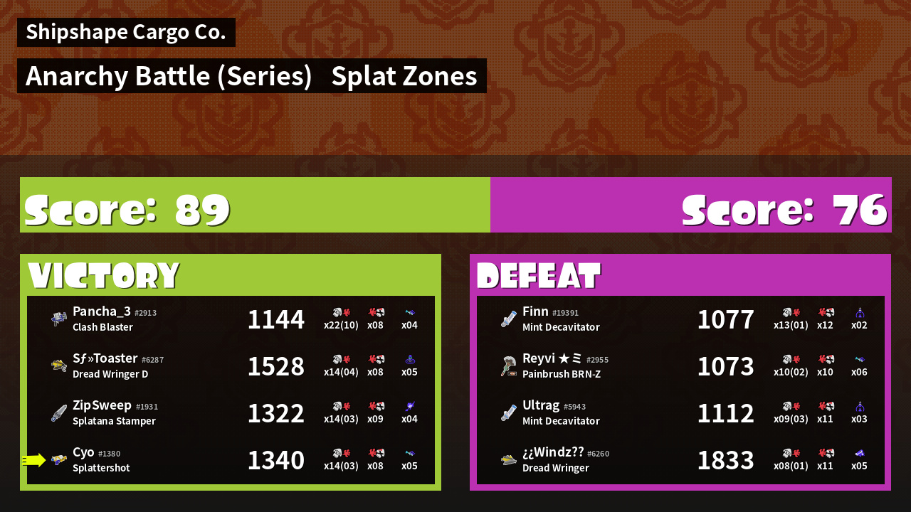 | Medals | #1 Splat Zone Guard #2 Overall Splatter #2 Turf Inker | ||