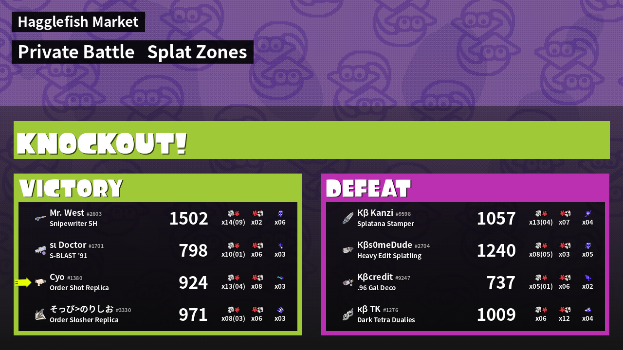 | Medals | #1 Enemy Splatter #1 Damage Taker First Splat! | ||