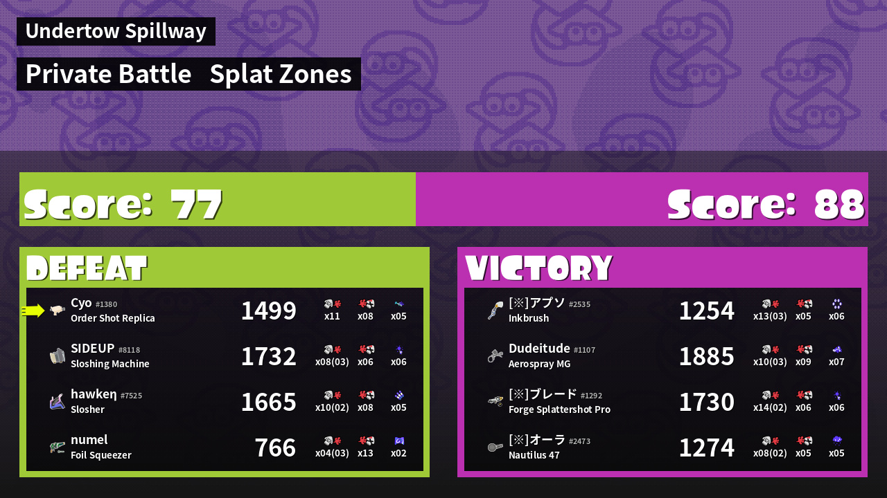| Mode | Splat Zones - Private Battle | ||