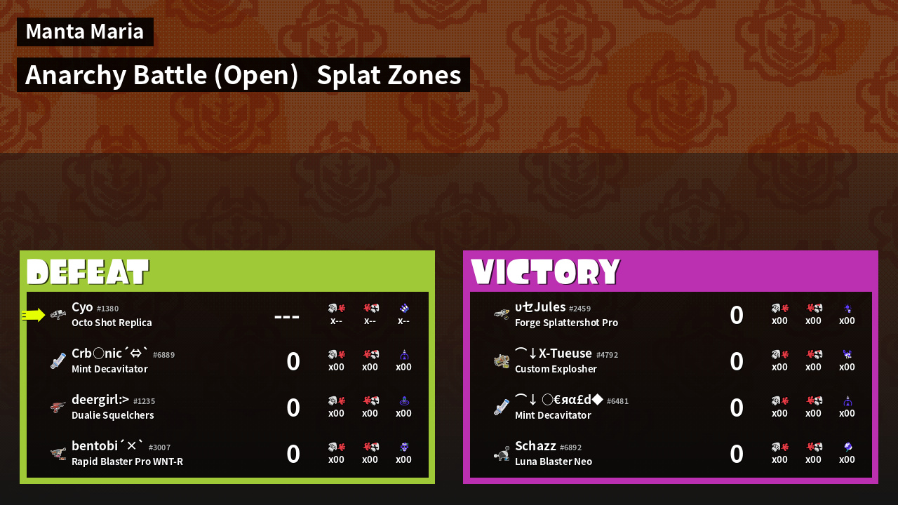 | Mode | Splat Zones - Anarchy Battle (Open) | ||