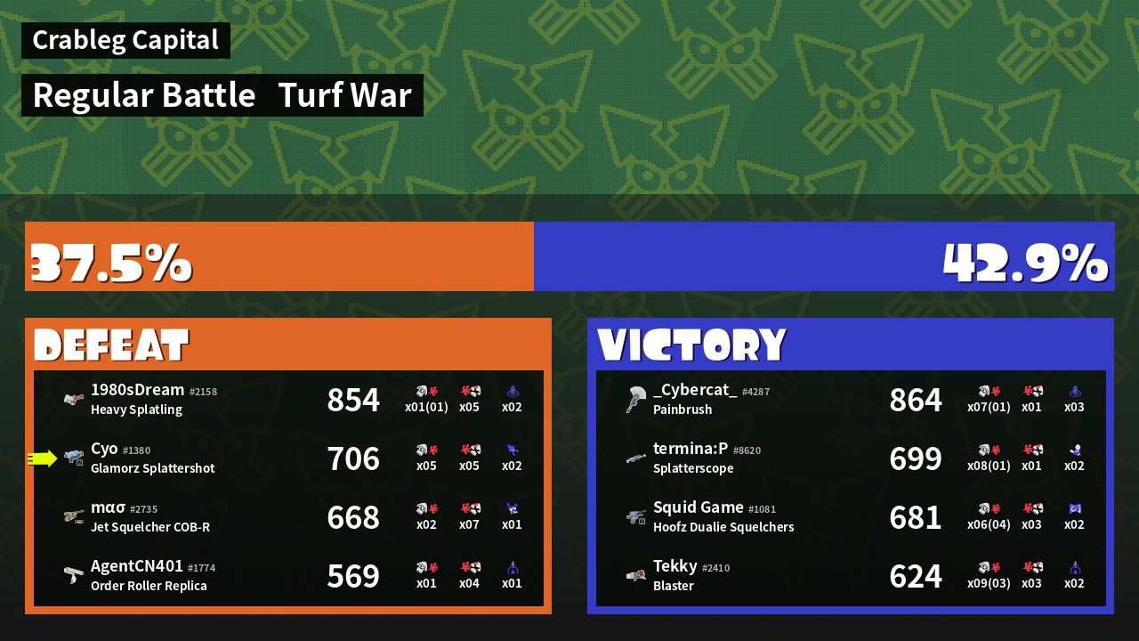 | Medals | #1 Overall Splatter #1 Popular Target #1 Home-Base Inker | ||