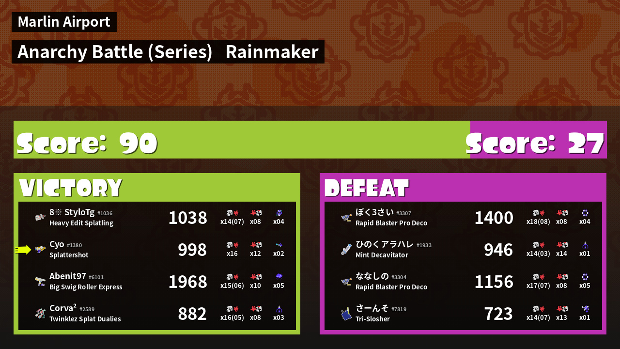 | Medals | #1 Overall Splatter #1 Enemy Splatter #1 Rainmaker Stopper | ||
