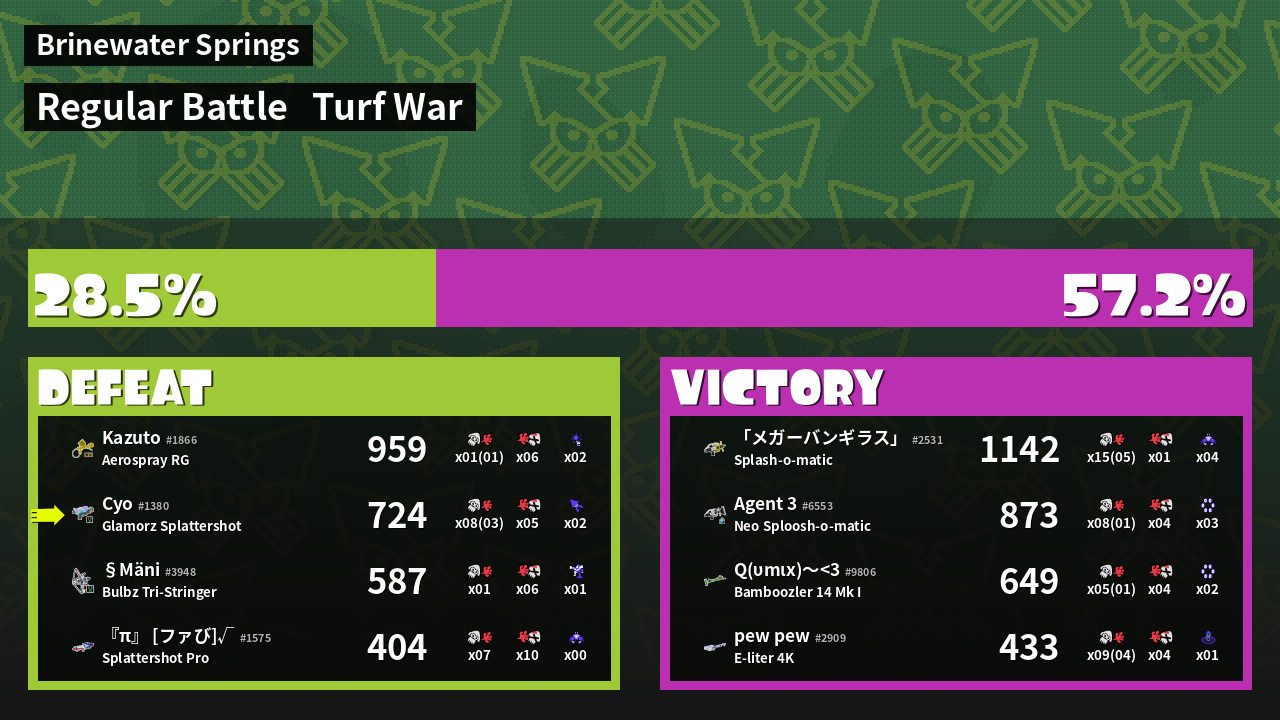 | Medals | #1 Overall Splatter #1 Enemy-Base Inker #1 Splat Assister | ||