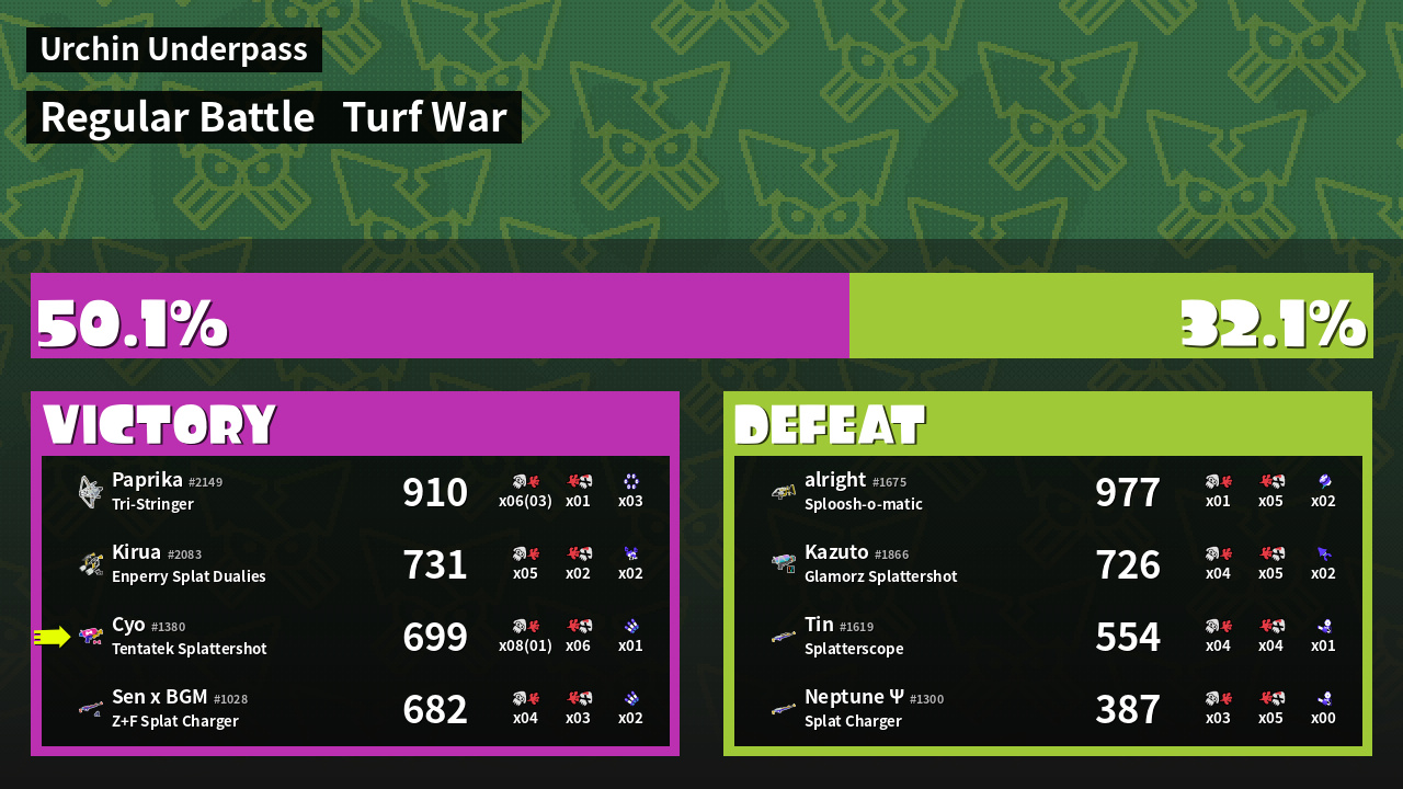 | Medals | #1 Overall Splatter #1 Enemy-Base Inker #1 Enemy Splatter | ||